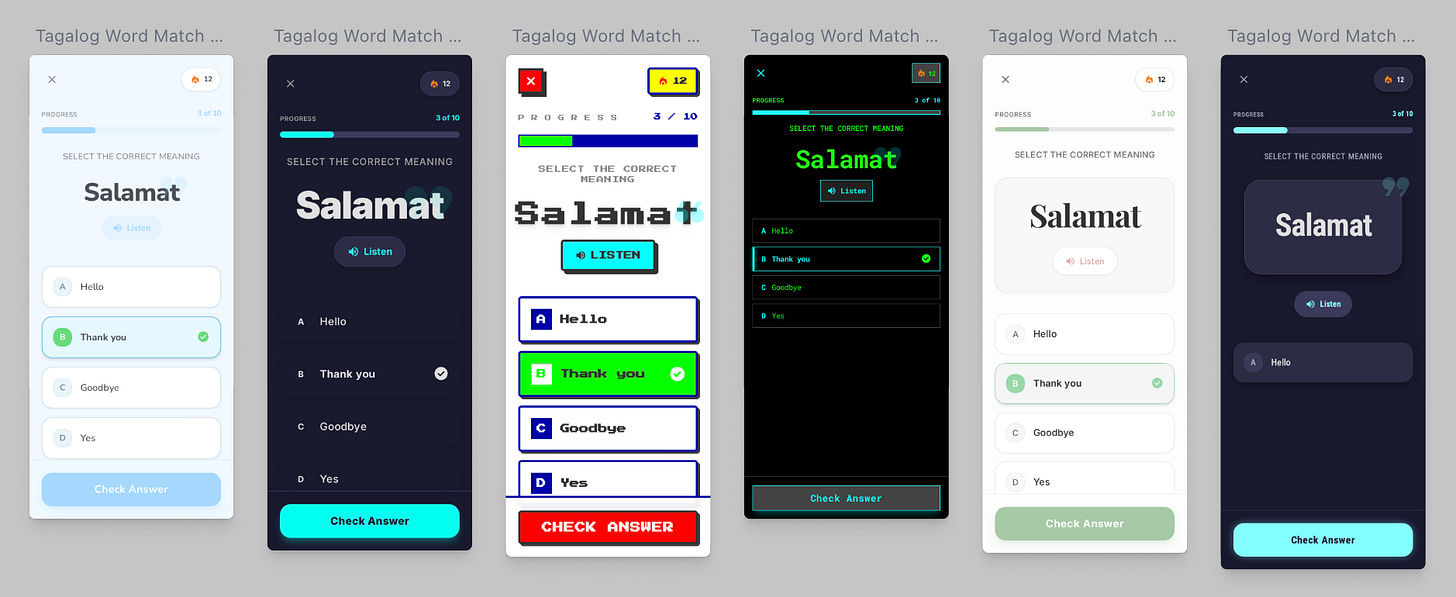 That first iteration with the army green scheme? I wouldn’t have requested it, but seeing it taught me that the blue hues mattered more than I’d realized. The retro arcade UI for the quiz app made me laugh, but it also clarified that I wanted something cleaner and more modern. Each “wrong” variation helped me articulate what “right” actually looked like.