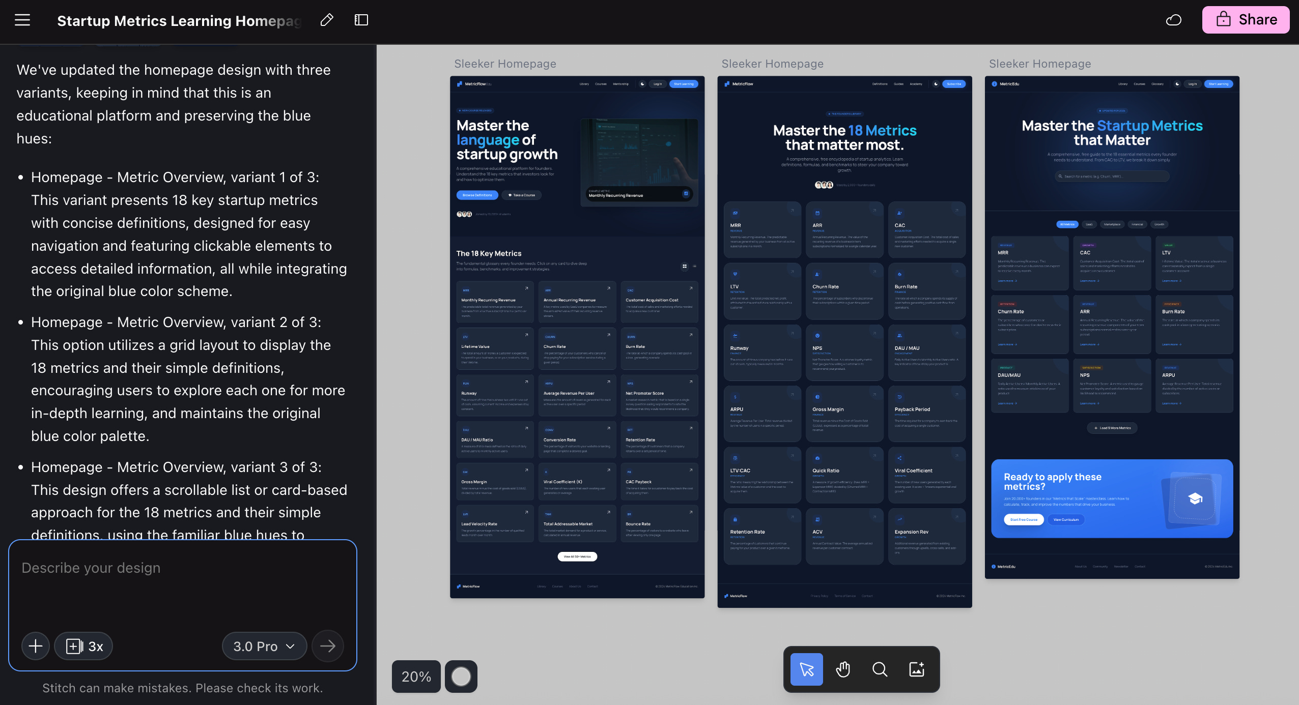 I gave Stitch the URL and asked for a sleeker homepage. The first iteration completely overhauled the colors — turning my blue hues into this army green scheme. It looked sleek, to be fair, but not what I was looking for. Stitch also misunderstood the purpose. It designed for a live metrics dashboard, not a learning platform where users explore definitions and sample calculations.